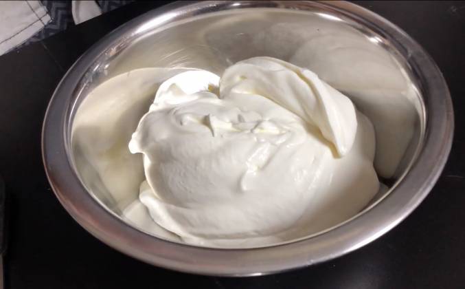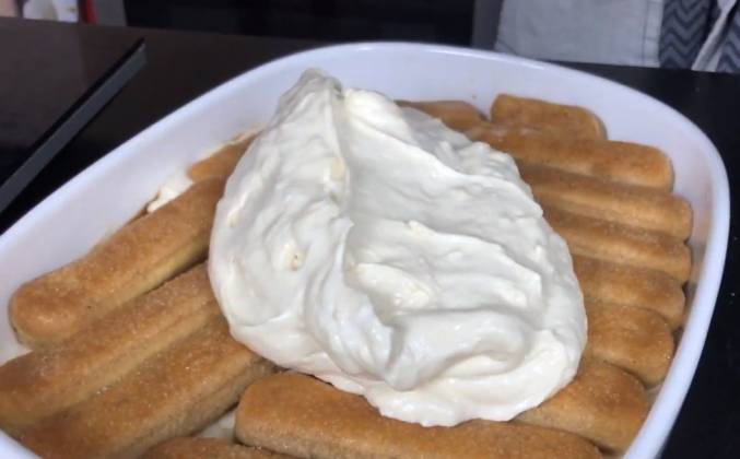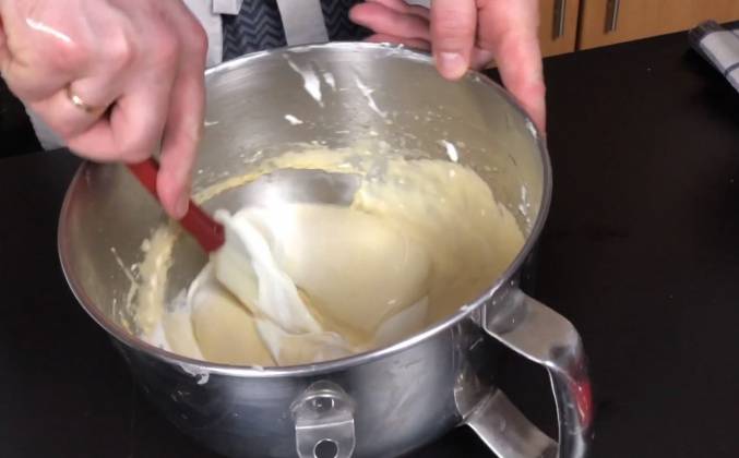 4. Итак, наша сырная масса с Pate a bombe готова. Теперь нам осталось добавить сюда сливки. Мы достаем сливки. Вот - масса сырная готова. Теперь мы добавляем сюда сливки за два приема. Показываю - как. Мы втыкаем в середину и переворачиваем. Как будто бы вскапываем массу. Таким образом мы максимально сохраняем пышность и сливок, и Pate a bombe. Делаем мы это быстро. Сливки холодные, сыр холодный. Желатин имеет свойство быстро застывать. Все масса наша готова. Вот посмотрите - она плотная. Такой мусс. Пришло время заняться savoiardi. Погружаем печеньку в сироп и выкладываем в форму. Всего у нас будет два слоя печенья и два слоя крема. Первый слой есть. Выкладываем крем. И теперь занимаемся вторым слоем. Вообще в классической рецептуре сюда еще идет амаретто или любой ореховый ликер. Но если у вас будут дети есть, то я бы не стал добавлять.