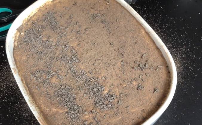 5. Итак там кофе есть, так что они будут у вас и без того неугомонные. Вот мы положили последний слой. У нас осталось чуть-чуть сиропа. Можете полить им свои савоярди - в этом нет ничего криминального. Мы собрали с вами тирамису. Теперь, чтобы он выглядел как тирамису, нам осталась самая малость. У нас же тирамису необычный. Поэтому и посыпем мы его необычно. Не какао, а шоколадом. Так вот мы его укутали. Чтобы шоколад не разлетелся, примнем ладонями. Его осталось убрать в холодильник, как минимум, на час, а лучше на два. Чтобы он там схватился, желатин бы полностью стабилизировался. После чего его можно разрезать и подавать к столу. Или же, если вы сделали торт, то дайте ему застыть. Лучше - в морозилке. Если вы собираетесь его велюрить или покрывать гляссажем - все зависит от вашей фантазии. Но мой любимый вид тирамису - вот такой. В такой форме, в корыте. Я бы сказал - ведро тирамису!Видео рецепт ютуб ниже 👇