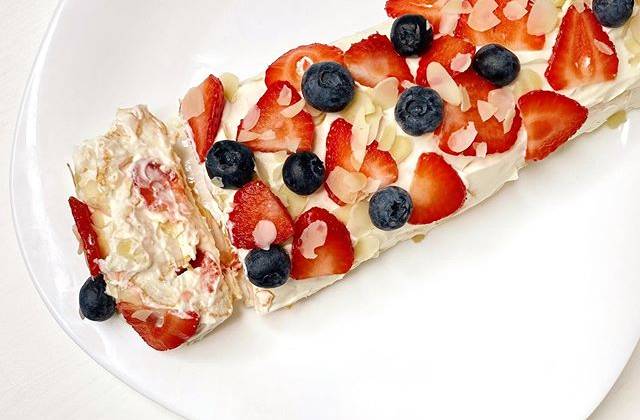 4. Для начинки: Все взбить блендером до однородности и загущения. Достать корж из духовки, перевернуть (чтобы орехи оказались снизу) на другой лист и остудить. Выложить крем и размазать, выложить нарезанные ягоды. Аккуратно начинаем сворачивать рулет, даже если корж немного будет трескаться - ничего страшного, все равно будем смазывать кремом. Остатками крема смазываем рулет и украшаем орешками, ягодами, чем угодно! ⠀ Даем настояться минимум 2 часа. Получается очень вкусно.