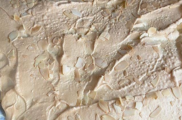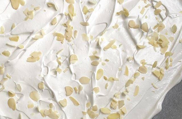 2. Получится масса, которая при переворачивании тарелки остается на месте и никуда не вытекает. Выкладываем меренгу на пергамент (лучше брать антипригарный), формируя прямоугольник (не сильно тонкий, и края сделать такими же, как и середину, потому что я так не сделала и края сильно пересушились), посыпаем лепестками миндаля или любыми измельченными орехами.