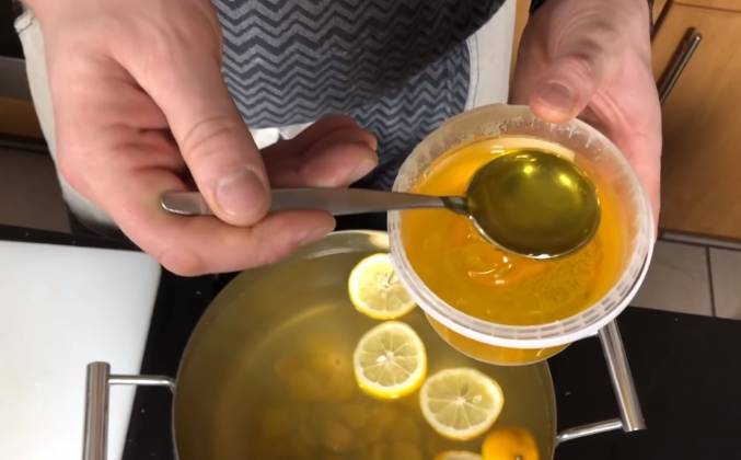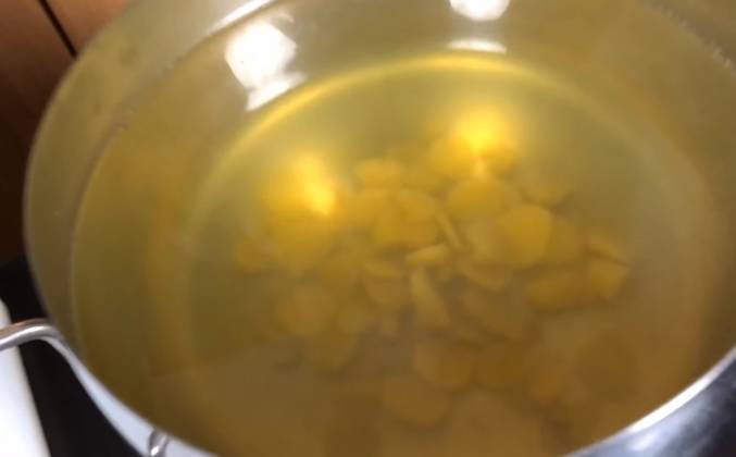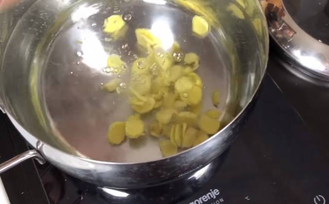 2. Вот, все - я его порубил. Так более чем достаточно. Теперь берем примерно 3 литра воды. Сюда добавляем 100 граммов имбиря и - все! Включаем нагрев и закроем крышечкой. Закипела наша вода, вот она кипит. 5 минут она покипела. Даже семь минут. Пришло время выключать. Выключаем. Вот, видите, какая стала водичка - жёлтая-жёлтая. Теперь ей надо остыть. Нам важно чтобы температура ее была не выше 80 градусов. То есть примерно 10 минут дайте отвару постоять без крышки. Когда напиток остыл... Ну, как остыл?