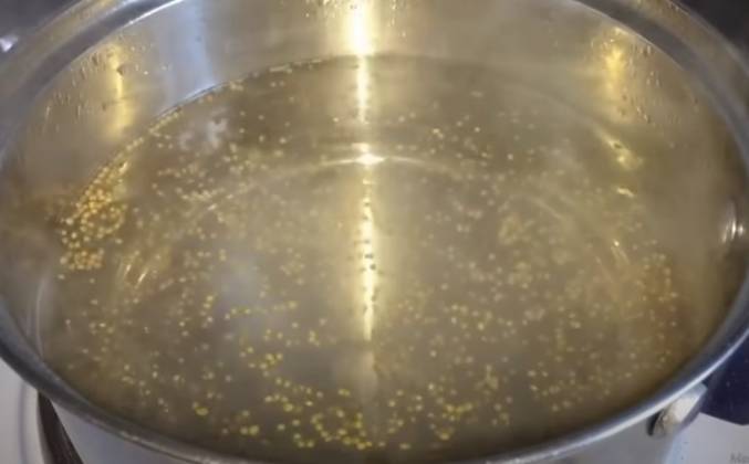 3. В кастрюлю я налила 1 литр воды, добавляю сюда 4 чайные ложки соли, это на литр воды, полторы столовой ложки сахара и одну чайную ложку семян горчицы, все перемешаю и дам прокипеть буквально три четыре минуты маринаду, маринад прокипел 4 минуты, я теперь добавляю сюда 9 процентный уксус 50 миллилитров, буквально полминуты или минуту прокипит и буду маринад разливать по банкам.