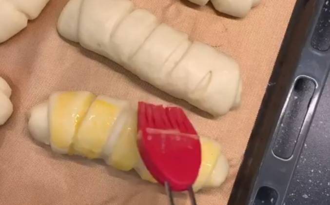 2. Брожение в тёплом месте (30-32 градуса) ~ 1.5 часа; в середине брожения 1 раз обмять тесто. Готовое тесто увеличено в объёме в 2-2.5 раза, воздушное. Разделить его на кусочки ~ по 70-75 г, подкатать в шарики, накрыть, оставить на 10 -15 минут. Раскатать каждый шарик в овал, на одной стороне сделать несколько вертикальных надрезов ножом для пиццы, с другого края поместить начинку, свернуть булочку, как на видео. ⠀
