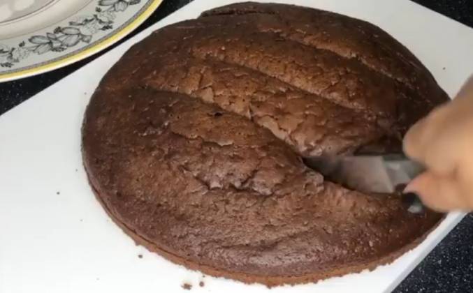 2. Ананасы нарезать небольшими дольками (1см). Грецкий орех измельчить не очень мелко (3-4мм). Остывший корж вынимаем из формы, с помощью тарелки вырезаем нужный диаметр коржа (20см), который будет фундаментом торта.