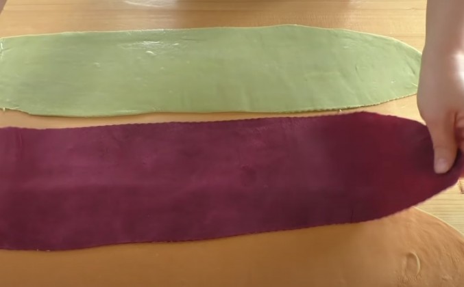 2. Тем более, что сейчас уже начнутся свои домашние огурчики. Можно будет такие вареники делать регулярно. Огурец измельчаем погружным блендером. И точно также заводим теперь уже зеленое тесто. Вот такое удивительно красивое тесто у нас получилось. Начнем с зеленого и будем раскатывать его в прямоугольник. Вот такой прямоугольник у меня получился, очень длинный. Толщина примерно миллиметра 2-3. Точно также раскатываем еще два цветных теста. Тесто слегка смачиваем обычной водой, чтобы скрепились слои. На зеленое тесто накладываем бордовое.