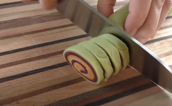 3. Максимально совмещая, а если где-то не совпадёт - ничего страшного. Тоже смачиваем И сверху морковное тесто. Верхний слой теста тоже слегка смажем. Я обрезала края, чтобы было все поаккуратнее. И теперь туго-туго Сворачиваем рулет. Если туго не свернем, будет дырка в середине. Вот такой у нас красивущий разрез получается, смотрите, какая красота - невероятно! Нарезаем на шайбочки. Все одна к одной Здорово же получилось! Каждую такую шайбу раскатываем, получается вот такой сочник Можно лепить вручную, а можно воспользоваться вот таким приспособлением. Начинку, кстати, тоже берите любую.