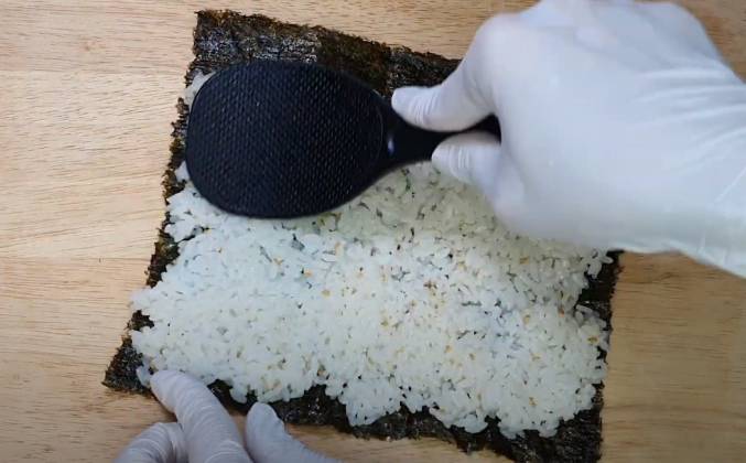 2. В готовый рис добавим немного соли, кунжутного масла и кунжут, хорошо перемешаем и выложим часть на лист морской капусты КИМ, равномерно распределяя по поверхности. Небольшую часть оставим без риса, а положим только несколько рисинок (они играют роль клея, не дают раскрыться кимпабу).