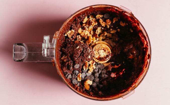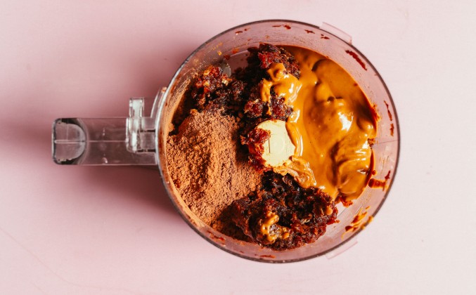 2. Добавить арахисовое масло, кокосовое масло и какао-порошок и пульсируйте до образования липкого теста. Оно должно быть липким и густым (соскребать его по мере необходимости). Наконец добавьте шоколадные чипсы и грецкие орехи (по желанию) и взбейте до однородного теста.