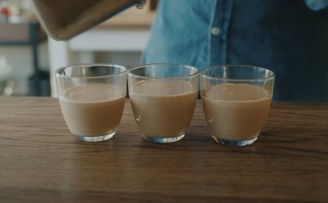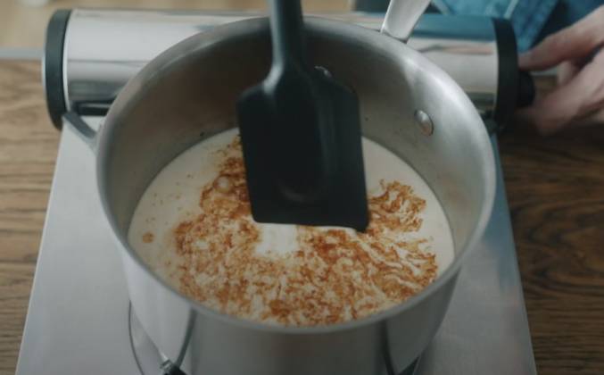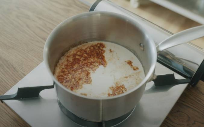 2. Наконец, выключите отопление и ждите цветного. Как только цвет станет правильным, сразу же добавьте молоко и взбитые сливки. Держите отопление выключенным. Добавляйте агар понемногу во время смешивания. Агар легко становится неуклюжим, так что не забудь добавить его понемногу. Сварить на среднем огне. Агар плавится только при температуре более 90℃. Его труднее расплавить, чем желатин. Полностью доведите его до кипения и выключите отопление. Затем медленно помешивайте около 30 секунд. Положите панна-коту в стаканы после того, как агар расплавится.