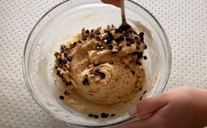 2. Сухие ингредиенты не кладите все сразу, потому что смесь может стать не однородной. Тесто готово. Теперь сверху крошим грецкий орех. Но это не обязательно. Для вкуса я положила грецкий орех и шоколад. Еще раз повторю, их класть не обязательно. И еще раз перемешаем. Заранее разогреем духовку. Я буду готовить в силиконовой форме. По желанию, можно приготовить в форме для маленьких кексов. Пирог можно приготовить в круглой форме. Всё на Ваше усмотрение.