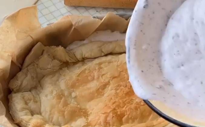 3.  В форму выкладываем сырое тесто, далее начинка, далее готовое тесто, начинка и последний пласт сырого теста.