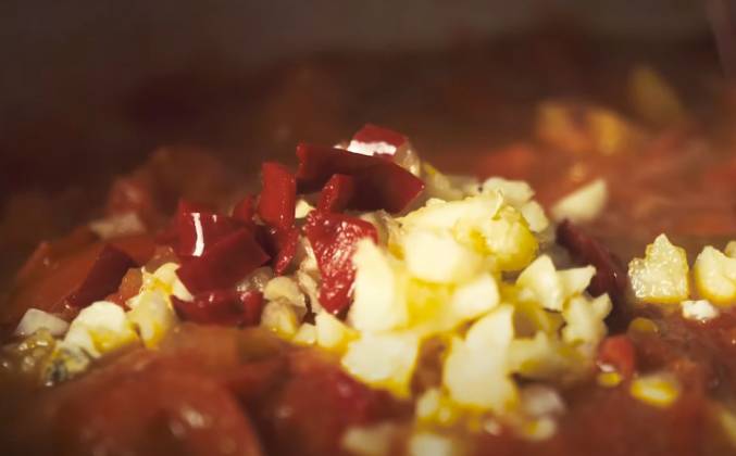 2. На счет других ингредиентов — тут все просто: 3 больших зубчика чеснока (его много не бывает) Чистите и дробите ножом. Рядом острый красный перец — это, конечно, если есть. Но блюдо пикантное, так что не помешает. Небольшой кусочек, избавляемся от семечек и режем. Также сразу нарежьте петрушку — хороший такой пучок! Будет вкусно, не переживайте. Так что пока вы резали да на. Кота смотрели.. (Мр. Кот) Лучше бы покормил.. Минут 5 уже точно прошло, так что посмотрим на томаты, подавим их лопаткой (как будто это что-то решает..) И одновременно делаете 2 дела: высыпаете чеснок и перец в сковороду, вместе с томатной пастой.