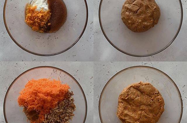 2. К полученному тесту добавить натертую на средней терке морковь, порубленные грецкие орехи и вмешать их в тесто. За счет сока от моркови тесто станет жиже, нужно добавить еще немного муки (у меня ушло 25 грамм). В итоге получится довольно густое и совсем слегка липнущее к рукам тесто, которое нужно убрать в морозильник на 10-15 минут.