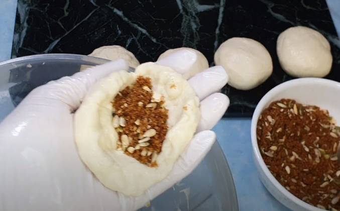 2. Небольшой кусок теста сформируем в лепешку руками, скалка не потребуется. На середину выкладываем начинку и защипав края, формируем колобок. На разогретую сковороду наливаем достаточно масла, и жарим слегка приплющенный колобок на маленьком огне до золотистого цвета.