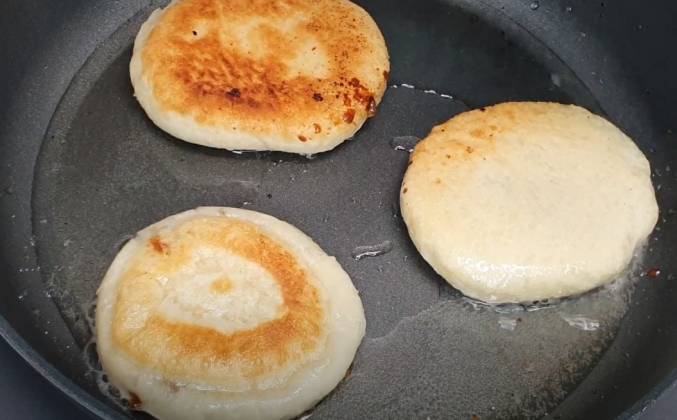 3. Переворачиваем и, прижимая ко дну, жарим с другой стороны. Вот такие слегка поджаренные получаются хоттоки Кушаем осторожно, можно обжечься расплавленным вытекающим сахарным сиропом.