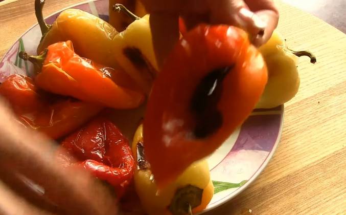 2. Остывшие перцы очищаем от шкурки, это легко делается. Отрезаем верх перца, аккуратно вычищаем семена. Брынзу разминаем ложкой. Заполняем перцы начинкой, но не плотно. Получается такой вот стаканчик.