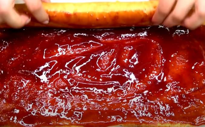 3. Смазываем начинкой, так как я делюсь с вами рецептом, восьмидесятых годов, то и хочу передать начинку того времени, обычно это было варенье, повидло, сгущенка или сметанный крем, у меня сегодня кисленький сливовый джем, хорошенько смазываем и заворачиваем, даём рулету окрепнуть, срезаем бока, для удобства я делю на 2 рулета, готовый рулет посыпаем сахарной пудрой.Видео рецепт ютуб ниже 👇
