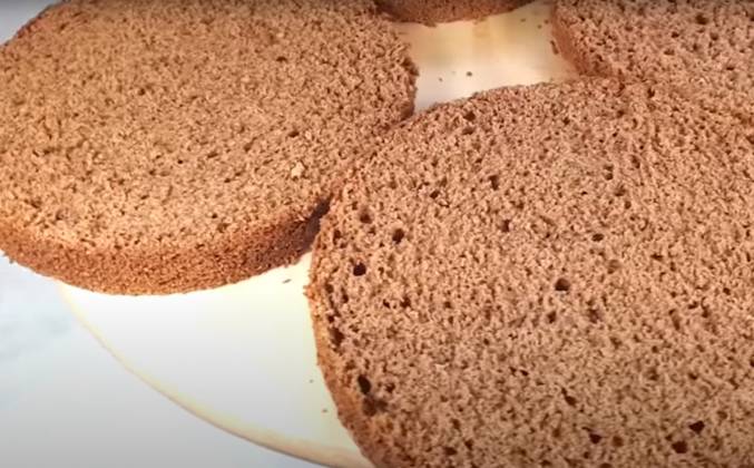 5. В результате получается вот такой красивый бисквит. Теперь его нужно завернуть в пленку и убрать в холод хотя бы на 3-4 часа (но лучше оставить на всю ночь). Затем, каждый бисквит можно разрезать на две части и собрать вкуснейший тортик из четырех коржей. В качестве прослойки отлично подойдут карамелизированные бананы и, например, шоколадно-карамельный крем чиз.Видео рецепт ютуб ниже 👇