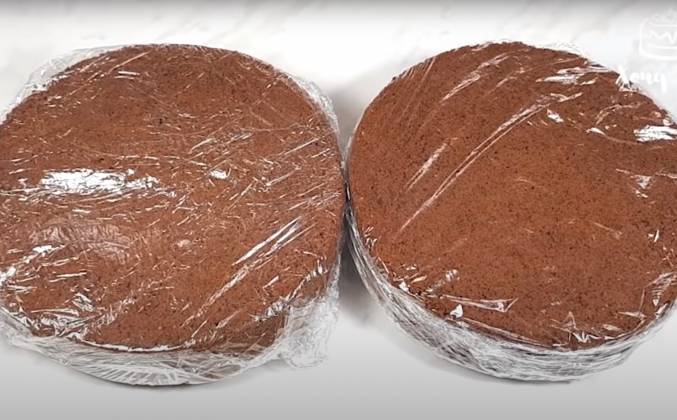 4. Берем два кольца диаметром 18 сантиметров, делаем донышки из фольги и устанавливаем их на противень. Распределяем тесто на две формы и отправляем в заранее разогретую до 175 градусов духовку, режим верх-низ. Пропекаться такой бисквит будет приблизительно 40 минут, в зависимости от вашей духовки. Готовность проверяем тестом на "сухую лучину". Шпажка сухая - достаём бисквит из духовки и устанавливаем на решетку вверх дном. В таком виде даем бисквитам остыть, а затем снимаем фольгу и освобождаем из колец при помощи ножа.