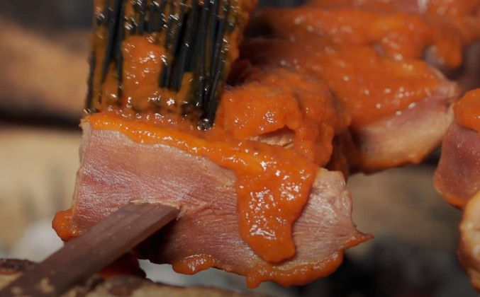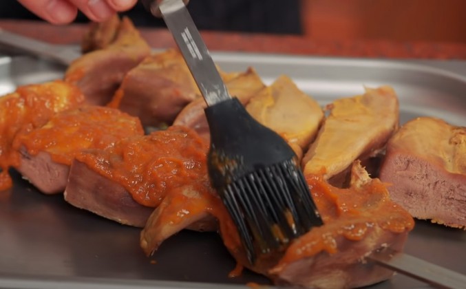 3. Просто времени уйдет немножко больше. Необходимо приготовить языки не полностью, а так, на 75-80% готовности. Итак, что я делал с языками, пока вас не было? Языки сварили, вынули из скороварки, очистили от шкуры. А все, что там осталось, это все обработали блендером, пропустили через сито, поставили на огонь и упаривали, чтобы смесь стала густой. Это не просто так смесь. Вы сейчас поймете для чего эта смесь. Каждый язычок, пропитавшийся овощными соками и ароматами, я режу на 2 равные части. И нанизываем на шампуры. Вы же знаете, вы догадываетесь, что я сейчас буду делать. Вот этой овощной загустевшей, но очень ароматной, очень вкусной смесью я смазываю язычки. И на мангал соусом вниз. И соусом будем обмазывать шашлыки всю дорогу, пока он только будет жариться, пока он только будет выпекаться на мангале. Соус будет подсыхать, а мы ему еще немного свеженький слой.