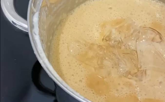 2. Замачиваем листовой желатин в любом количестве холодной воды на 15 минут. Замачиваем порошковый желатин в 40 мл холодной воды на 15 минут. Сливки нагреваем практически до кипения - добавляем горячие сливки в сахар и сразу перемешиваем. Варим все вместе 5 минут на медленном огне. Снимаем с огня и даём остыть в течение пары минут.