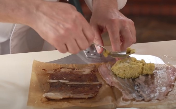 3. Ни к чему он здесь. Вы знаете, если вы будете готовить это блюдо, то вам не придется разрезать шкуру напополам. А я режу шкуру на две половины, потому что хочу провести опыт. А какой опыт, вы узнаете чуть-чуть попозже. Потому что сейчас я включу печку, включу прогреваться и печку, и верхний гриль. А в печку я поставлю камень для пиццы. Этот камень у меня от другой печи, но он идеально подходит. Вы посмотрите, какой он толстый. Он в себя тепла наберет очень много. У меня вот какая идея. Я надеюсь, что вы ее уже поняли. Снизу нашей пиццы будет рыбья шкура, на которой будет лежать рыбный фарш. А уже на рыбном фарше будет лежать то, что обычно кладут на пиццу. И получится такой слоёный пирог. Только я очень люблю рыбью шкуру, ведь это коллаген, белок. Мы ради белка и едим что мясо, что рыбу, что птицу. Будет ли хрустеть рыбья шкура так, как я люблю? У меня появилась одна идея, которую я сейчас хочу проверить. Немного растительного масла я наливаю на одну половину пекарской бумаги. Прямо на бумагу посыпем немного крупной соли. И на бумагу же насыпем немного кунжута. Это тот самый кунжут, которым посыпают булочки и лепешки. Я думаю, что на рыбьей шкуре он сработает замечательно. Берем рыбью шкуру и укладываем ее на бумагу.
