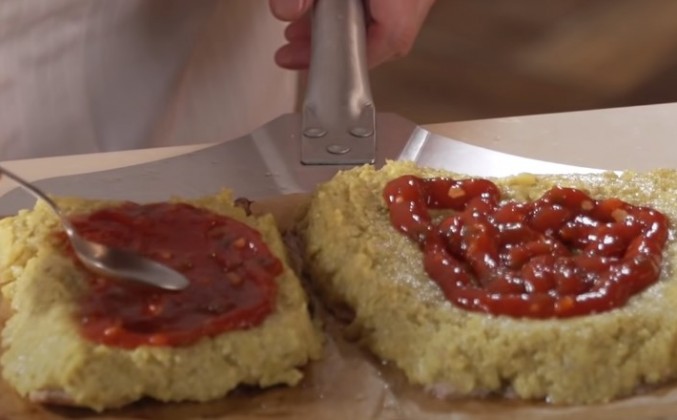 5. И вот наконец настал тот момент, когда мы можем собирать наши будущие пиццы. Накладываем фарш. Если ложка цепляется за фарш, тянет его за собой, то смочите ее водой. И сразу все получается намного лучше и намного аккуратнее. Мне хочется сделать такую ванночку, лунку под соус. Поверх любой пиццы, понятное дело, необходим томатный соус. В прошлом году я готовил неаполитанскую пиццу. Вот здесь эти ролики вы можете посмотреть. Самым трудным и самым долгим было приготовить хороший томатный соус. А мы сегодня и так провозились. И я уверен, что кетчуп-лечо "Махеевъ", No1 среди российских семей, не подведет. Раскладываем начиночку. Ну и надо засыпать сыром. Давай в печь. Меня только одно волнует. А не слишком ли близко к верхнему грилю я подкладываю эту конструкцию? Не слишком ли быстро запечется сыр? Но ничего, мы можем наблюдать через стеклянную дверцу. И как только сыр начнет золотиться, мы переставим нашу пиццу на самый нижний уровень. Это против всех правил, но пусть пропечется как следует. Вы знаете, сколько стояла пицца? Столько, сколько положено для обычной пиццы и еще полстолько. Вот в этой печке заложена автоматическая программа на пиццу на 12 минут. У меня стоит примерно 20 минут. Но у нас пицца толстенная. И рыба речная должна пропечься хорошо, как следует. Вы посмотрите, какая красота. Дрожит, пузырится, испеклась. Кто любит сыр порумянее, чуть пораньше надо было переставлять на верхний уровень.