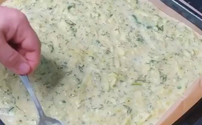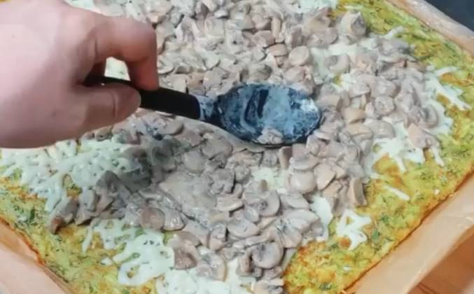 2. Противень застилаем пергаментом и смазываем растительным маслом, выкладываем нашу массу и распределяем её по всей поверхности. Отправляем в духовку на 20 минут при 180 градусах. Мелко Нарезаем шампиньоны и обжариваем добавив ложку сметаны. Достаём наш кабачковый лист из духовки.