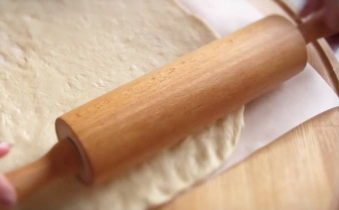 2. Для соуса я взяла столовую ложку томатной пасты и развела в стакане воды. Добавляем кориандр, базилик, хмели-сунели, щепотку соли и сахара и размешали. Из этого количества ингредиентов получается три большие пиццы. Руки слегка смажем маслом. Отрываем третью часть теста и немного растягиваем его . Укладываем на пергаментную бумагу , руками аккуратно распределяем. Получается вот такой тонкий круг. Перекладываем на слегка подогретый противень и выкладываем начинку.