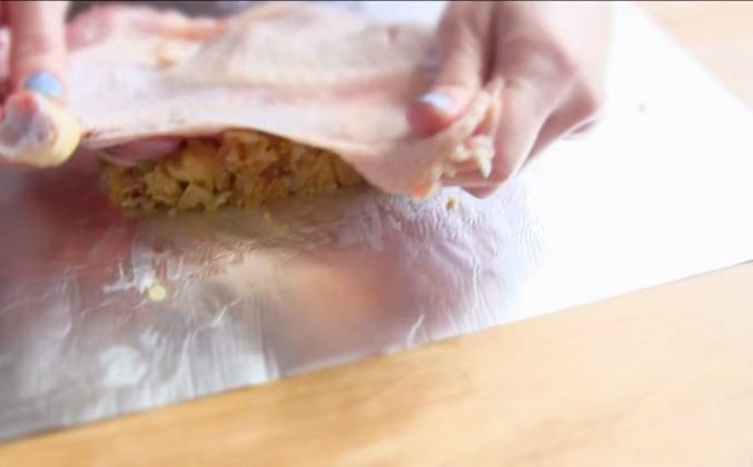 2. Затем накрываем крышкой , выключаем огонь и оставим что бы крупа разбухла. Окорочка промыть, затем сделать надрез ножом вдоль всего окорочка, с внутренней стороны. Нужно отделить кости от мякоти. Оставляем лишь часть косточки примерно 2 см. , подрубив её. Окорочек посолить и поперчить. Теперь к начинке добавляем одно сырое яйцо и перемешиваем. Разделим на три части. Отрезаем кусок фольги , длиной примерно 40 см. и складываем в два слоя. В центр выкладываем начинку горкой.