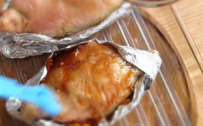 3. Накрываем подготовленым филе. Заворачиваем фольгу в форме лодочки. Концы подворачиваем под низ. А кончик куриной ножки, нужно поставить так, будто это голова будущей курочки. Ставим в горячую духовку на 15 минут. Температура 180 градусов. Смешать мед и соевый соус. Добавить чесночек. Через 15 минут вынуть блюдо и полить соусом курочек. Отправляем обратно в духовку ещё примерно на 20-25 минут. Подавать можно прямо в фольге или порционно.