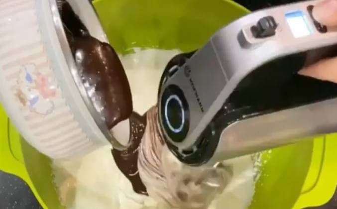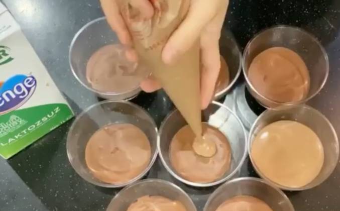2. Затем добавляем нашу шоколадную массу и быстро перемешиваем. Кладем массу в каймак также быстро помешиваем миксером и разливаем в стаканы. Готовый мусс кладем в холодильник на 10 минут. 2 часть: В молочный шоколад добавляем теплое молоко перемешиваем добавляем нашу 2 часть желатина заранее подогретую в микроволновке.