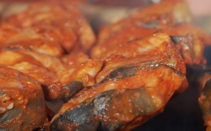 3. Необходимо, чтобы обмазка из йогурта и специй как можно быстрее превратилась в румяную устойчивую корочку, но при этом рыба внутри не должна перегреться. Обратите внимание, что куски рыбы все нанизаны одинаково. Я сделал так для того, чтобы сначала как следует прожарить шкуру и спинку. Посмотрите. Вы видите, как спинка шипит? Ага, пора поворачивать. Потрогайте рыбу пальцем. Если она стала упругой, то значит она готова, готова полностью. И это означает, что можно желать приятного аппетита!Видео рецепт ютуб ниже 👇