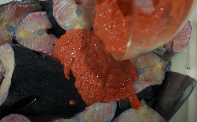2. Густой, обволакивающий, ароматный и очень красивый маринад готов. Топорик, молоток, перчатка. За голову. Заливаем маринадом рыбу, тщательно перемешиваем. И накрываем крышкой либо пищевой пленкой, чтобы за 12 часов, пока рыба маринуется в холодильнике, весь холодильник не пропах. Вы ели шашлык из стерляди, осетрины? Многие не любят, говорят, что невкусно, сухо получается. Вы знаете, почему сухо? Так пережаривают все. Именно поэтому в моем мангале уголь полыхает.