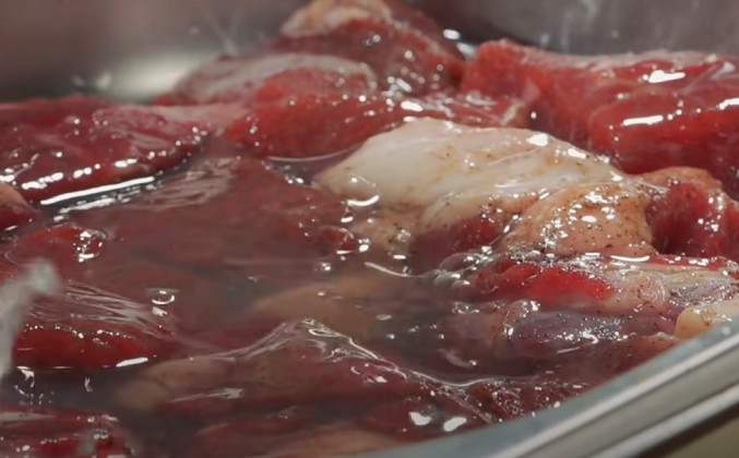 3. Вы знаете, что у меня в кувшинчике? Здесь волшебная жидкость. Вы взяли лук, пропустили его через мясорубку и отцедили сок. Ведь когда мясо маринуют с луком, то именно луковый сок действует на мясо. А луковый жмых здесь нам ни к чему. Вы посмотрите, как под воздействием лукового сока мясо моментально меняет свой цвет. Пусть постоит часа 3-4. После этого можно начинать готовить. Отлично замариновалось мясо. Вы только посмотрите какие кусочки. Они уже буквально полупрозрачные. Нанизываем на шампуры. Ох, какой шашлык! Один кусок мяса лучше другого. Такой шашлык требует яркого, мощного угля. Готовиться он должен очень быстро, минут 6, не больше.
