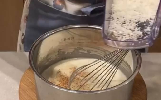 3. В результате масса начнёт густеть, но мы не прекращаем размешивать ее венчиком. Затем снимаем сотейник с плиты, все время помешивая. Добавляем в соус соль, перец, горчицу, мускатный орех и натёртый на мелкой терке пармезан. Все хорошо перемешиваем.