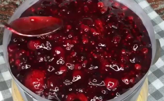 3. Для ягодной прослойки: Ягоды заранее размораживаем в сотейнике и добавляем к ним сахар и крахмал. Хорошо перемешиваем, чтобы не было комочков и ставим на средний огонь, варим ИНОГДА помешивая до загустения. Варим на среднем огне, чтобы привкус крахмала полностью исчез. Снимаем и добавляем набухший и отжатый желатин, перемешиваем и даём остыть до 30-35С, накрыв пленкой в контакт. Заливаем поверх мусса и отправляем в холодильник на ночь.