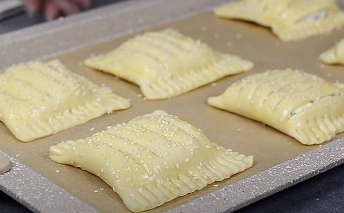 3. Толщина пласта около 3мм. Нарезать тесто на прямоугольники ~ 16х8 см. Выложить по 40 г начинки на каждый кусочек (почти на край). Защипнуть края и придавить их вилкой. Сверху сделать по 34 надреза и переложить изделия на противень застеленный пергаментом. Яйцо взбить вилкой и смазать слойки. По желанию посыпать кунжутом. Выпекать при 200 ºС 30 минут. У меня электрическая духовка, режим верх/низ без конвекции. Ориентируйтесь пожалуйста по своей духовке. Охладить слойки на решетке.