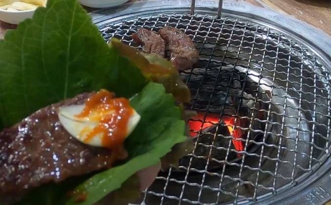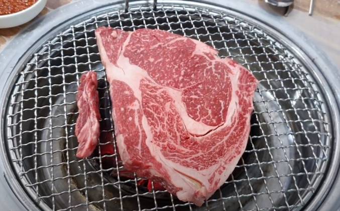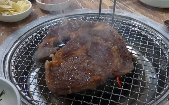 Как приготовить стейк из мраморной говядины на мангале рецепт по корейски. Сегодня видео нашего ужина вне дома. Мы ужинали в местном ресторанчике, жарили корейскую говядину на углях. Посреди стола углубление для емкости с углем, поверх ставится решетка. Помимо стандартных приборов подают щипцы и кухонные ножницы. Сначала мясо жарят целиком, в середине процесса разрезают на кусочки поменьше. Степень прожаренности каждый выбирает сам.