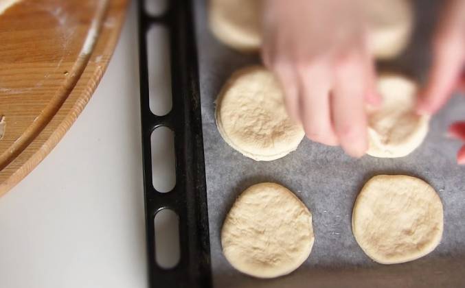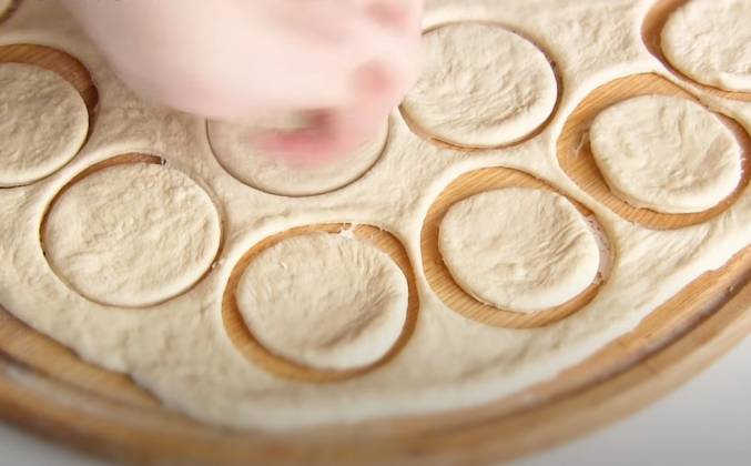 2. Поверхность присыпать мукой. Раскатать пласт, примерно толщиной в пол сантиметра. Вырезать кружки с помощью стакана. Противень застелить бумагой и смазать растительным маслом. Выкладываем друг на друга кружки, смазав каждый водичкой.