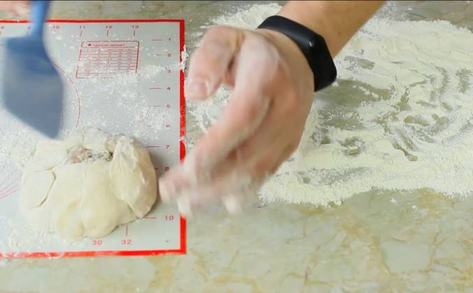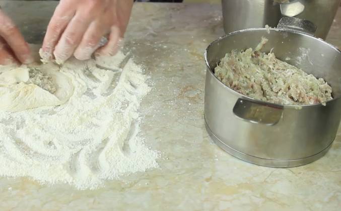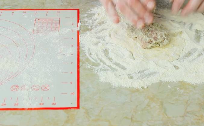 4. И потом будем жарить беляши! Ждем! Итак, ребята, прошел у нас час с копейками, наверное. сил больше нет терпеть, будем пытаться лепить! Я посыпал стол мукой. Поскольку тесто достаточно жидкое, я сейчас этой же мукой вот так вот свои ручонки слегка обработаю! И буду попытаться вот от этого теста отщипнутьть какую-то часть! Ну, буду мерить типо столовой ложкой, посмотрим что из этого получится! Может быть даже этого маловато, возьму побольше... И пытаюсь из этого сформировать такую супер-нежную (ну, как бы это сказать?) лепешечку... Я ничего особенно не леплю, просто вот я распластал, потом беру какую-то часть фарша, формируеу из неё котлетку (это будет наша начинка), ну, и кладу, чтобы начинки было, так сказать, немало. но и чтобы все весь беляш она не перекрывала. И потом вот так аккуратненько эти края к центру закрываю, оставляя небольшую дырочку в середине.