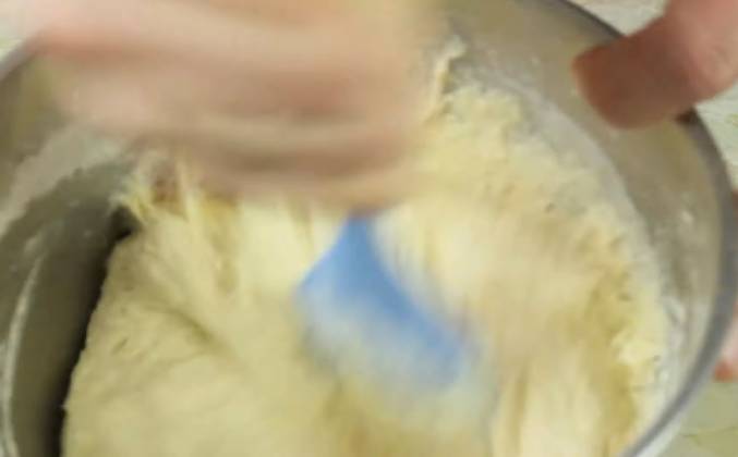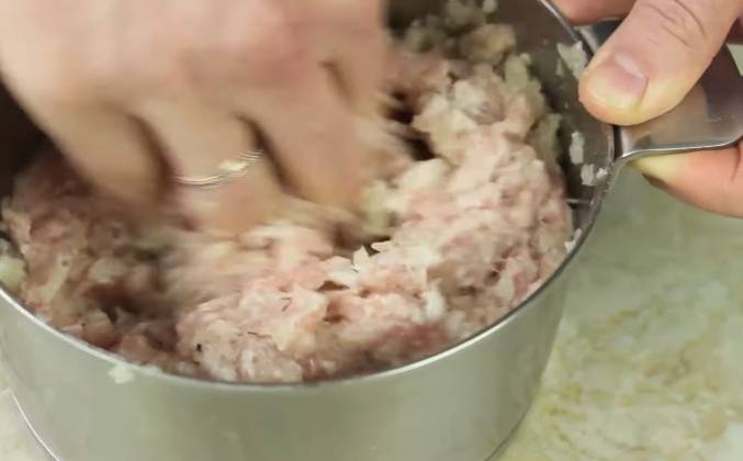 2. Поэтому я вот сейчас перемешал лук с мясом, и я оставлю его мариноваться на целый час (как минимум). Кто-то вам скажет что этого можно не делать. Можно не делать, конечно! Но это существенно влияет на вкус, поэтому будьте внимательны к деталям! Я закрываю крышечкой, чтобы она никуда не убежала и отправляю в сторонку. Через час мы к нему вернемся, тем более, что и тесто у нас тоже должно будет постоять! Кстати говоря о тесте! Поехали! Я беру какую-то емкость, в которой я сейчас все буду смешивать! И вбиваю туда абсолютно спокойно 2 яйца. Раз. и два. Яйца я просто разбиваю. В разбитые яйца мы добавляем сразу весь наш кефир, столовую ложку сметаны. Всё это дело перемешиваем до однородности, подсаливаем. Исюда же сразу высыпаем пару чайных ложек сахара и чайную ложку соды. Все это вместе перемешиваем. Муку можно вываливать частями, можно сразу!