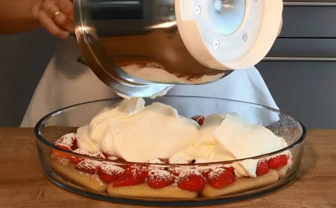 3. Взбитые сливки смешаю со смесью маскарпоне и йогурта и выложу сверху на клубнику. Тирамису поставлю в холодильник на 3 часа для застывания. Готовый тирамису можно посыпать какао перед подачей на стол. Приятного аппетита!Видео рецепт ютуб ниже 👇