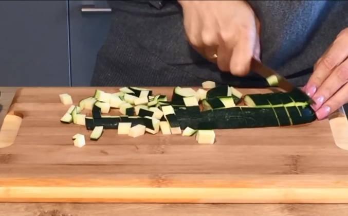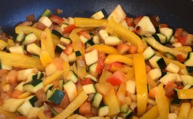 2. Обжаренное мясо убрать со сковородки. Нарежу овощи: лук и чеснок нарежу мелким кубиком, помидоры и кабачок крупным кубиком, перец нарежу на небольшие полоски.