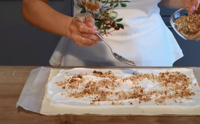 2.  Белок я взбила до белой пены и взбивая буду медленно всыпать сахар в течении 1,5-2 минут. Белок взбился. Это хорошо видно по пику на венчике или если провести ножом, то хорошо виден срез. На тесто нанесу белок оставляя с одного края 1,5 см. без белка, посыплю орехами. Скатаю в плотный рулет начиная от намазанного края. 3.  Рулет нарежу на кусочки и выложу их на противень. Получившиеся розочки разравняю. Второй рулет также разрежу на пирожные. Поставлю в предварительно разогретую духовку на 20-23 минуты на 200. В духовке с конвекцией можно выпекать сразу два противня. Пирожные из слоёного теста с белком готовы. Приятного аппетита!
