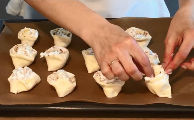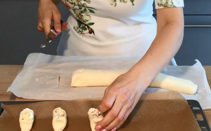 3.  Рулет нарежу на кусочки и выложу их на противень. Получившиеся розочки разравняю. Второй рулет также разрежу на пирожные. Поставлю в предварительно разогретую духовку на 20-23 минуты на 200. В духовке с конвекцией можно выпекать сразу два противня. Пирожные из слоёного теста с белком готовы. Приятного аппетита!Видео рецепт ютуб ниже 👇