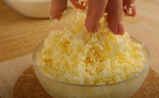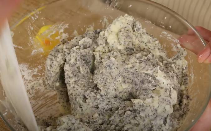 3. Добавляем творог с яйцом к молочно-маковой смеси, она уже застыла, стала более густой. Перемешиваю до однородности. На этом этапе особо большие комочки манной каши я вынула лопаткой, более мелкие оставила и надеюсь это ни на что не повлияет. И настало время собирать наш тортик. Для того две трети песочного теста выкладываю на дно и бортики. Хорошо утрамбовываю. Форма для выпечки 18 см и прежде я застелила дно пергаментом и края, чтобы было удобнее распределить тесто пергамент по краям зажала обычными прищепками, после того как бортики будут утрамбованы их можно будет снять.