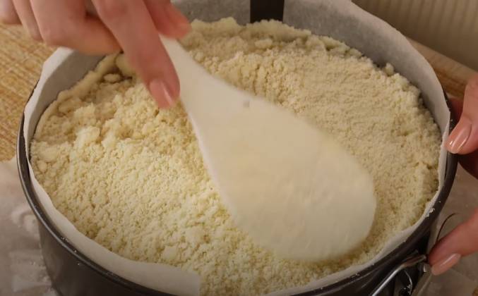 4. Теперь выкладываем начинку заполняя все дно, высотой этот тортик у меня получится примерно 4 см. Когда начинка хорошо распределена засыпаю сверху оставшимся песочным тестом, разравниваю и немного утрамбовываю. Выпекаю тортик в разогретой до 160 градусов духовке ровно 1 час до легкого подрумянивания. И теперь необходимо полностью остудить пирог, на это у меня ушло примерно 1,5 часа, и то он остался немнооого теплым внутри. Снимаю весь пергамент - это кстати очень удобно, ничего не пригорает и в последствии гораздо легче мыть формы для выпекания. Готово!Видео рецепт ютуб ниже 👇