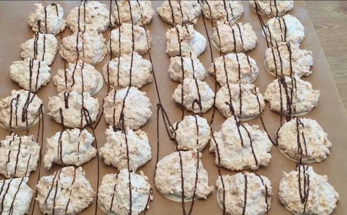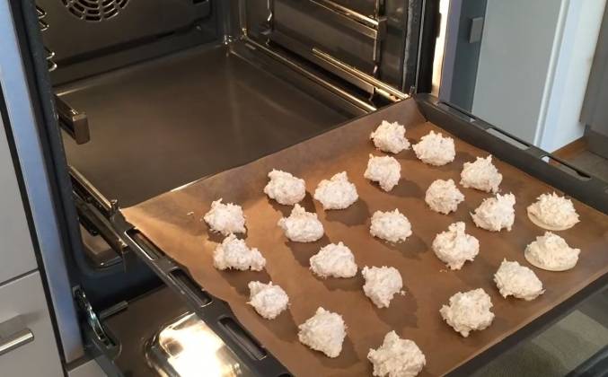 2. Это отчётливо видно по пику на венчике. Или если перевернуть чашу миксера, то белки останутся в ней и даже не начнут съезжать вниз. Во взбитый белок я добавлю остывшую кокосовую стружку и перемешаю лопаткой аккуратными движениями снизу вверх. Получается красивое пышное тесто с золотистыми вкраплениями. Теперь я буду формировать кокосовое печенье. Это можно сделать двумя способами. Взять такие вот облатки для выпечки и выкладывать на них кокосовую массу горкой. С ними печенье получается более аккуратное, одинакового размера. Эти облатки не что иное, как прессованная мука смешанная с крахмалом. Или мы возьмём две ложечки и выложим кокосовую массу горкой на расстоянии друг от друга на противень с бумагой для выпечки.