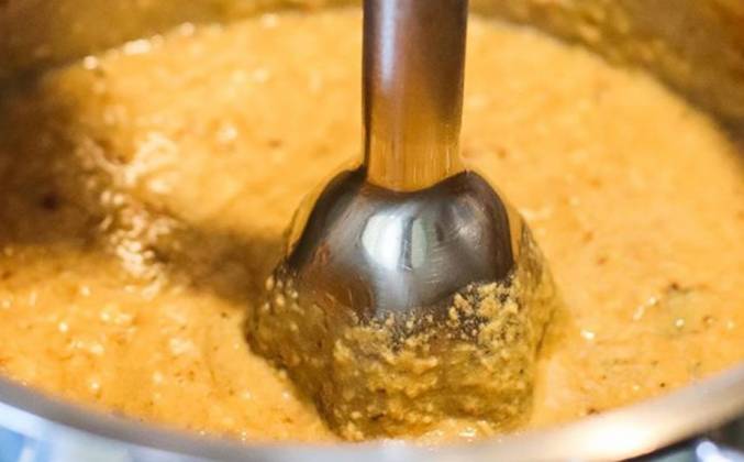 3. Выключить огонь и пробить погружным блендером для гладкой текстуры. При необходимости добавить немного кипятка и перемешать, таким образом доводя соус до идеальной консистенции.